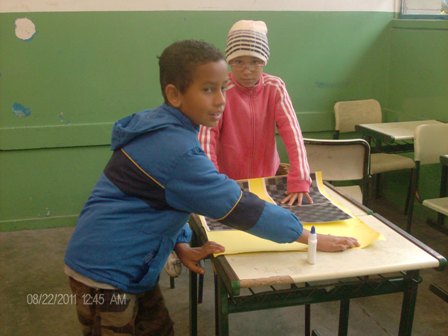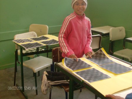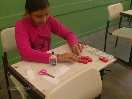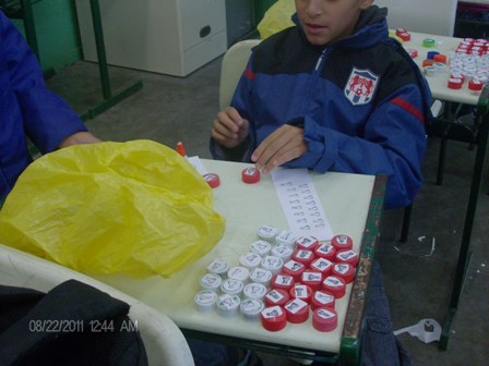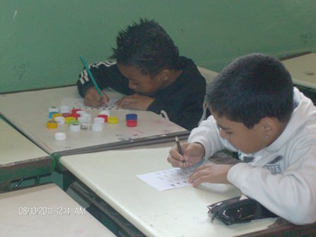 Alunos confeccionando as peças e o tabuleiro do jogo, com material reciclável, e
